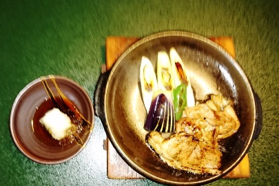 次に出てきたのは、土鍋の上でジュージューと音を立てている、アツアツの「鴨焼き(ネギ・ナス・ピーマン添え)」で、大根おろしを乗せていただきます。