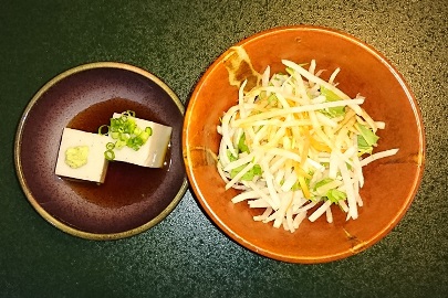 前菜は「そばとうふ」と「(大根)サラダ」で、サラダの方は予想通りのシャキシャキした食感のサラダですが、そばとうふは少し胡麻豆腐のような甘みのある香ばしい逸品でした。