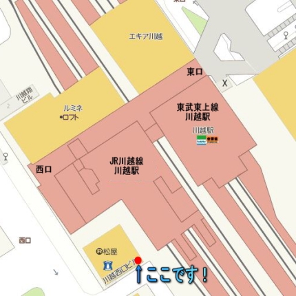 住所は川越西口ビルの1階ですが、ローソンと牛丼の松屋ばかりが目立つのでわかりにくいため、地図を添付しておきます。
