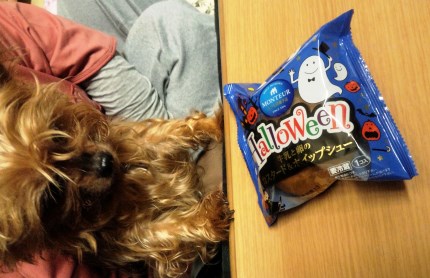 夕飯後、デザートに買ったハロウィン仕様のシュークリームを食べようとテーブルの上においたら、テンがススッとyossieの膝上に乗りシュークリームにくぎ付け。