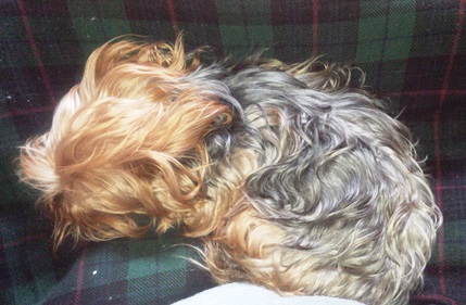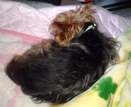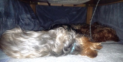 テンはわずらわしいのが嫌いなので、他のワンズのいる場所は避け、毛布をひざ掛けにしているyossieの足元にくっついています。