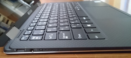 左側面。左から、USBtypeC-Thunderbolt3・ヘッドセットポート(躯体があまりにも薄いので、アルミ枠を削っておさめています)・バッテリー充電ステータスボタン・バッテリー充電ステータスライトです。