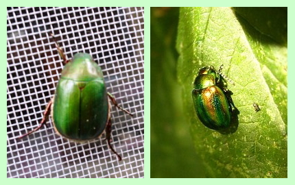 よく知られているコガネムシ(写真右)のような輝く緑金色ではなく真緑色ですが、やはりきれいです。