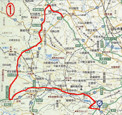 川越から最短距離の道を探すと、県道単位の道で複雑。